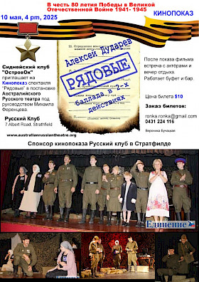 К 80 годовщине Победы в Великой Отечественной Войне 9 мая 2025 года в Русском клубе Стратфилд прошёл кинопоказ спектакля А. Дударева " Рядовые " в постановке Австралийского Русского театра под руководством Михаила Ференцева.