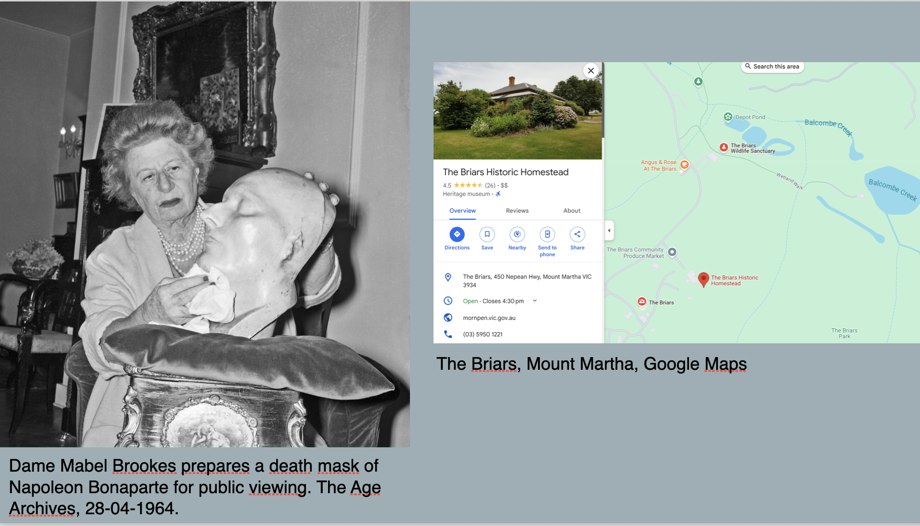 Имение «Брайарс» в Морнингтоне (TheBriarsHistoric Homestead), Mornington Peninsula), недалеко от Мельбурна, принадлежало семье Балкомб до 1976 года, а сейчас охраняется государству. Здесь и хранятся, в основном, все сохранившиеся вещи Наполеона и планируется создать музей. Коллекция включает в себя копию посмертной маски Наполеона, локоны его волос, медаль Почетного легиона и мебель, которой он пользовался во время своего пребывания у семьи Балкомб. Кое-что из памятных вещей императора есть и в Галлерее штата Виктории.