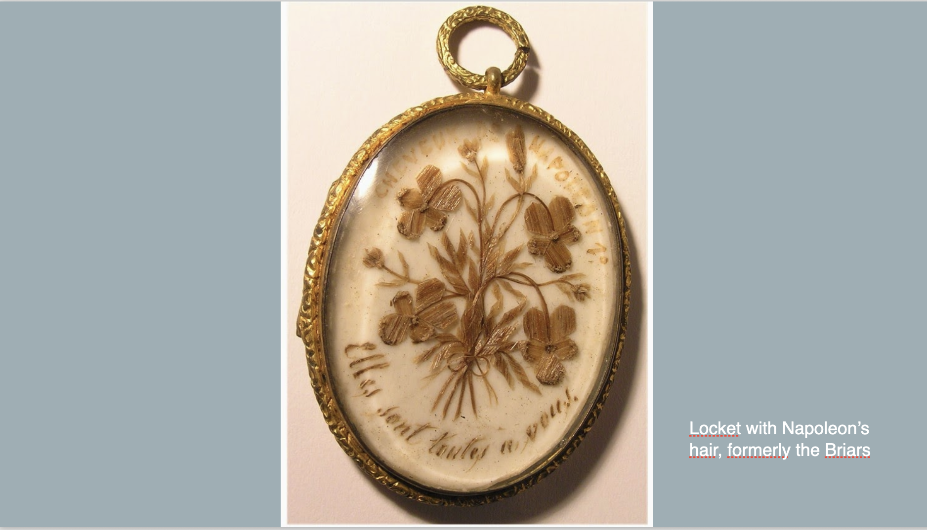 К сожалению, лет 10 назад некоторые памятные вещи были украдены из «Брайарс», особенно жаль медальона с фиалками, сделанными из волос Наполеона. Фиалки ассоциировались с Наполеоном в связи с его первым изгнанием на Эльбу, после которого он вернулся, и его сторонники стали использовать цветок как тайный знак.