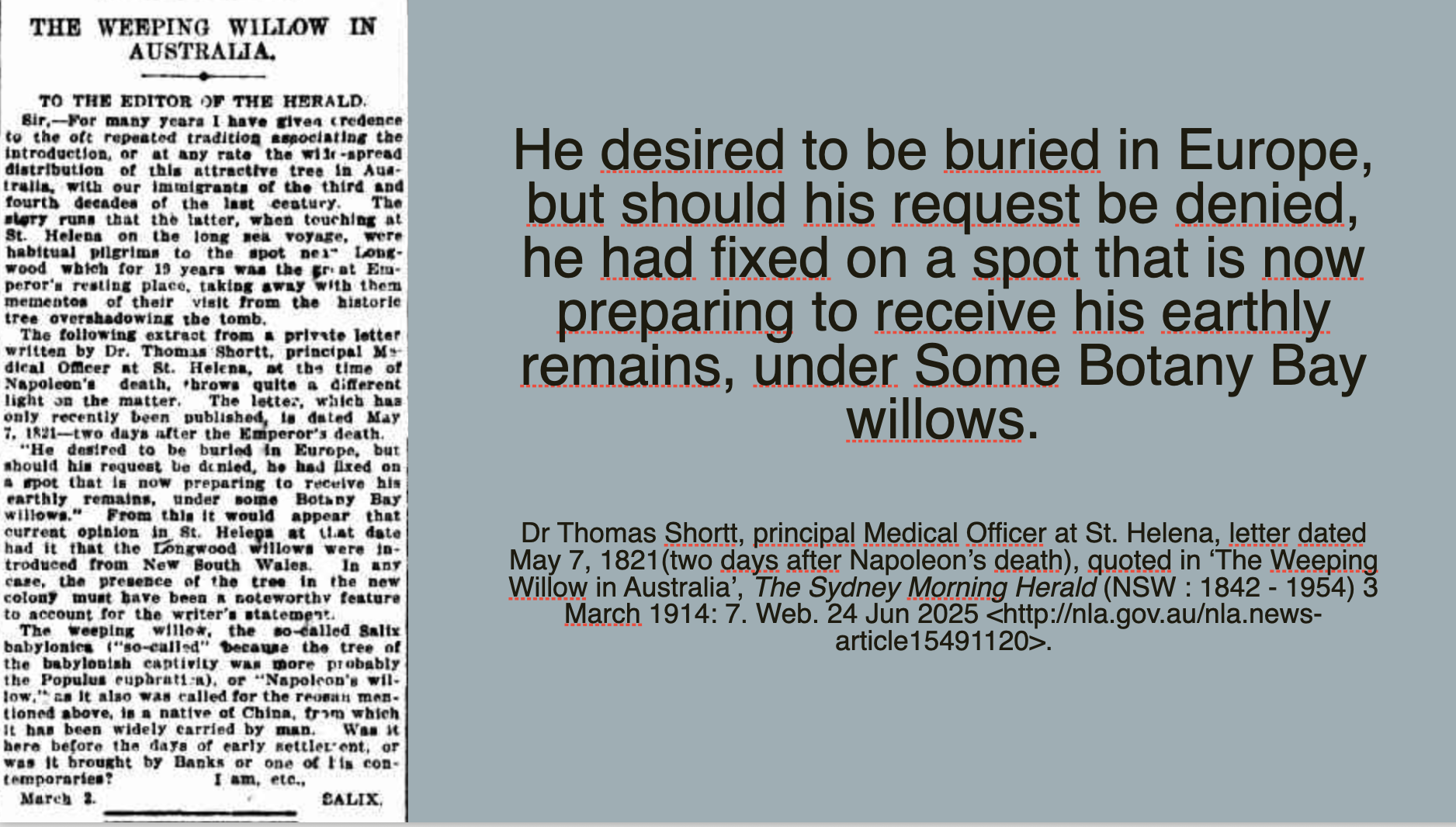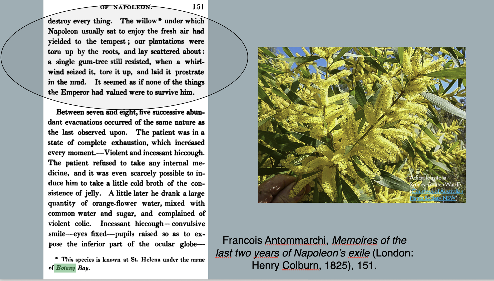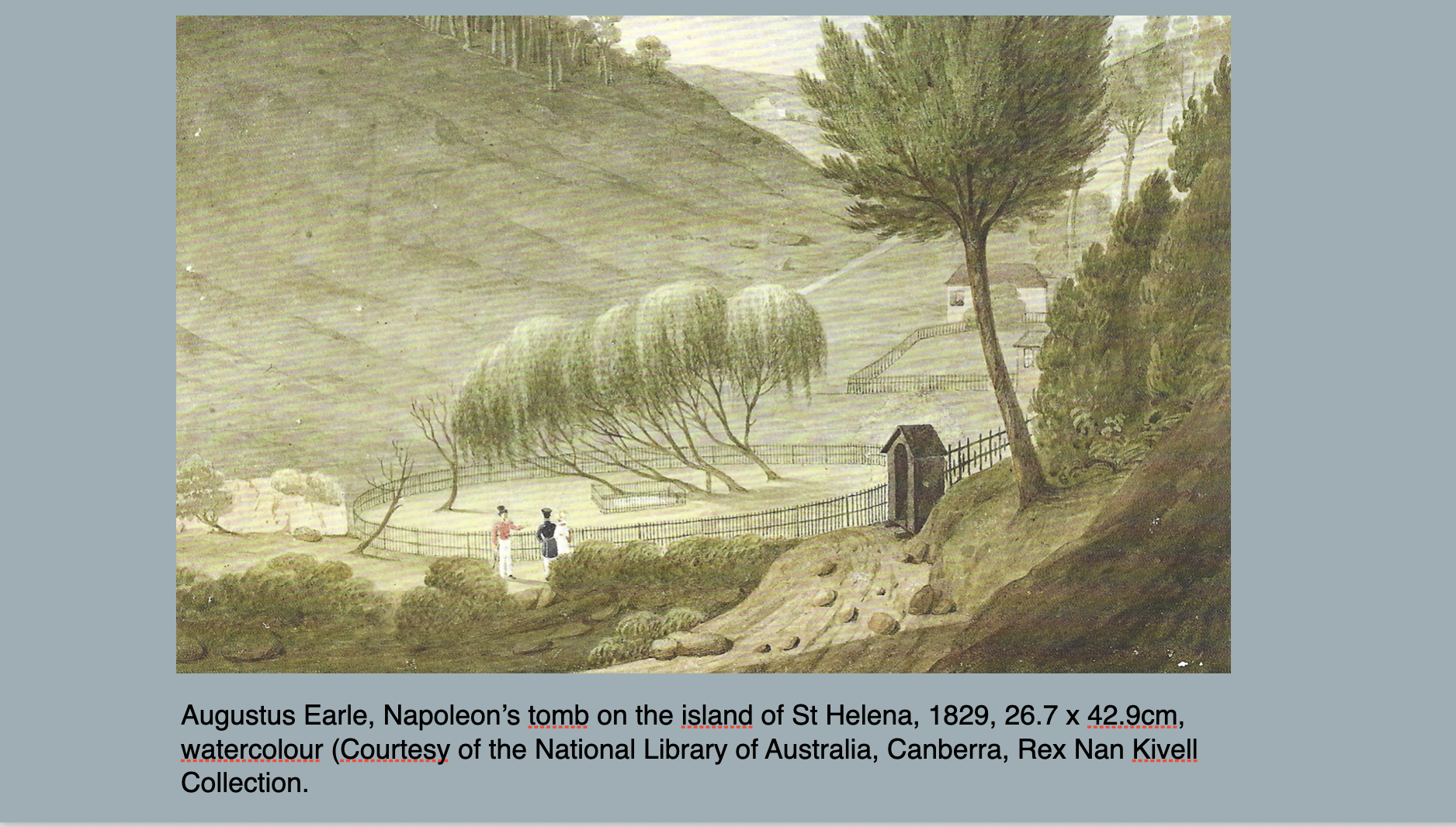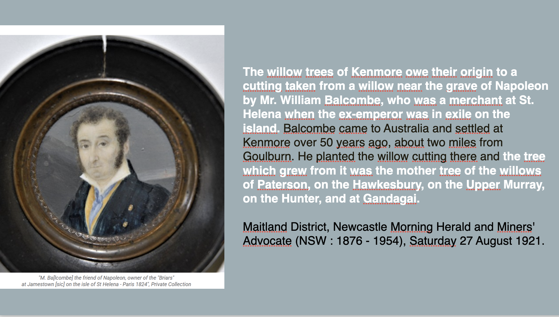 Во второй части лекции Екатерина познакомила нас с новым, еще не законченным, этапом в ее исследовании связей Наполеона с Австралией. Эта история о том, как ивы с могилы Наполеона «захватили» Австралию.