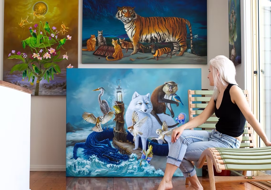The artist’s deep love for animals is evident in every painting. Her work also reflects a continual search for universal truths and hidden wisdoms, often exploring themes of the unknown and mystical forces. Many of her characters appear to be on a journey—mirroring the artist’s own love for exploration and discovery. Through her paintings, she aims to evoke joy, encourage kindness, and promote acceptance of all living beings.
