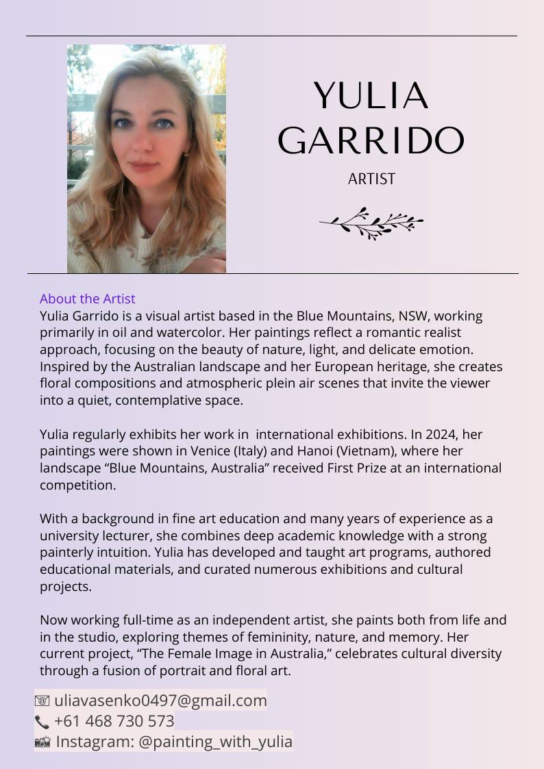 Романтика Земли— персональная выставка Юлии Гарридо (Yulia Garrido) в Русском клубе, Сидней с 1 ноября до 1 декабря 2025 года.