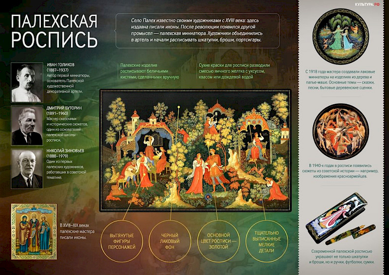 В Палехе работают художники, создающие уникальные, известные всему миру лаковые миниатюры, эту славу создали русские народные художники, сохранившие традиции этого искусства, пришедшего из Китая в 17 веке. Мастера-иконописцы Палеха расписывали Грановитую палату Кремля, храмы Троице-Сергиевой лавры и Новодевичьего монастыря. Так традиционная технология темперной живописи закрепилась на лаковых шкатулках. Написанные золотистыми красками на черном фоне образы «рассказывают» сказки и былины русского народа, сохраняя при этом утонченность. Для примера, приводим фотографии нескольких лаковых миниатюр Палеха. Надеемся, это даст объяснение стилю нашего баннера, созданного к Арт-фестивалю.